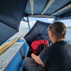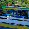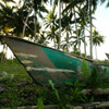 Glücklicherweise wartete schon ein blaues Jukung (schmales Holzboot mit Auslegern) mit einem rudimenären Dach auf uns, wir kletterten über rutschige Steine hinein und saßen die nächsten zwei Stunden dort im Schneidersitz mit unseren Regenschirmen bewaffnet, während der Regen unter dem Dach durchfegte. Später, als es trockener wurde, konnte man sich auch etwas bequemer hinfläzen, während wir sehr langsam zur nächsten Insel tuckerten.