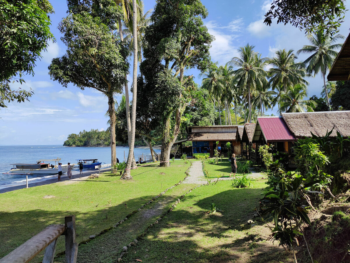 Auf Una-Una wurden wir direkt am Strand des »Pristine Paradise« abgeliefert und bezogen unsere einfache, aber nette und komplett Tsunami-unsichere Holzhütte mit (üblicherweise) gemauertem dachlosen Bad, einer Hängematten-Veranda und direktem Seeblick. Man merkte an Kleinigkeiten, dass einige Schäden des langen Corona-Leerstands noch nicht ganz behoben waren, aber alles funktionierte schon einigermaßen.