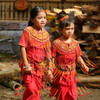 Der ganze mit Tongkanon gesäumte Platz war zwischen den Häusern mit schicken kleinen Bambus-Logen ausgebaut, die nummeriert waren und den Gästen zugeteilt wurden. Wir übergaben bei Ankunft eine Stange Zigaretten, wie es hier Sitte ist und landeten mit zwei Japanerinnen und ihrem weiblichen Guide Ritha in einer Loge in der Ecke. Auch hier wurden alle Gäste, geladen oder nicht, erst mit Tee/Kaffee und Süßigkeiten (u.a. diese sehr leckeren Hundewürste aus Sesam, Zucker und Ingwer), später dann auch noch Mittag mit Reis und einer Auswahl aus Schwein mit Sojasauce, Schwein mit einem Spinatähnlichen Gemüse oder gebratenem Tofu. Statt Teller gab es ein zu einer Schaufel gefaltetes, gewachstes Blatt braunes Papier, mit dem man alles in der linken Hand halten konnte, während man mit den Fingern der rechten Hand das leckere Essen in sich reinstopft. Sehr einfach, aber praktisch!