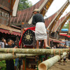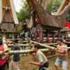 Der nächste Stopp, wieder etwas näher an Rantepao, war interessanterweise die Beerdigung, der wir schon am ersten Tag auf eigene Faust einen Besuch abgestattet haben. Inzwischen war man dort sehr fleißig: der ganze Platz sah buchstäblich aus, wie ein Schlachtfeld: bestimmt mindestens 5 tote Büffel wurden gerade nicht sehr zimperlich von einigen Männern mit Messern an langen Stielen in Stücke gehackt. Es roch nach Blut und halbverdautem Gras aus den Mägen der Tiere. Ein Ansager kommentierte das Gemetzel (und die Verteilung der einzelnen Teile) laut per Mikrofon.