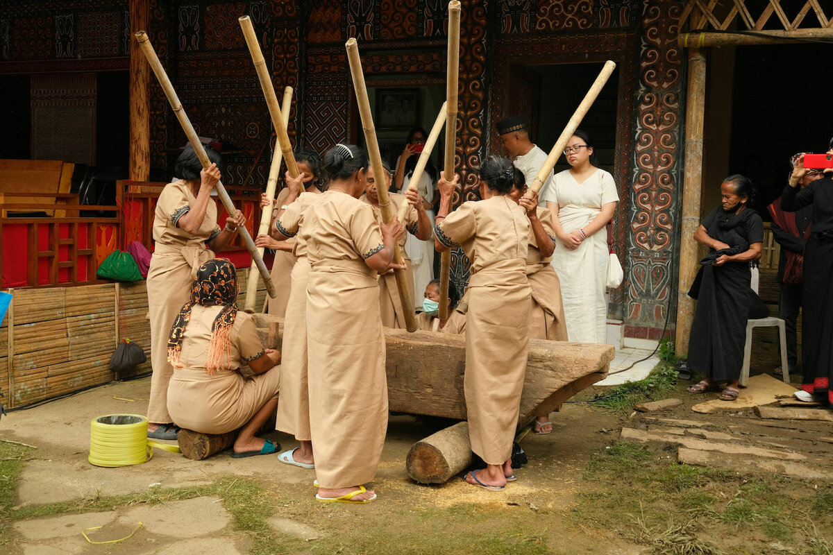 Auf dem Platz wurde währenddessen der in einem kleinen Haus stehende Sarg in einem Tragegitter aus Bambus präpariert, das Tao-Tao der Verstorbenen wurde auf einen kleinen Pritschenwagen gesetzt und ein paar Frauen in brauner Tracht fingen an, auf einer hölzernen Wanne, die zum Stampfen oder Dreschen von Reis verwendet wird, einen lauten Rhythmus zu schlagen. Der Umzug mit dem Sarg sollte beginnen, der Sarg wurde – noch ohne Dach – auf die Straße getragen.
