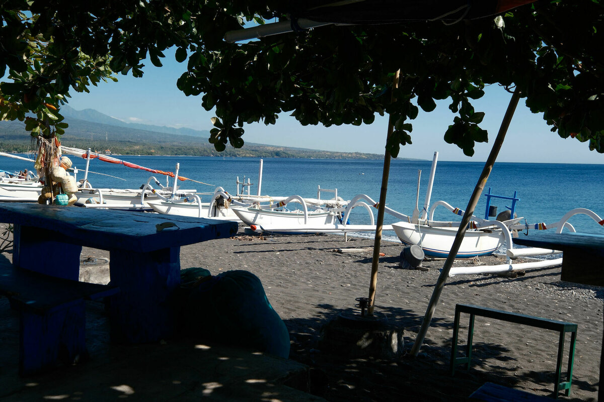 20. Juli 2023, Amed – Unser kleiner und einfacher Bungalow liegt wirklich direkt auf dem Strand. Nach ca. 10 Metern ist man im Wasser – sofern man nicht über eines der kleinen weißen Fischerboote mit Auslegern gestolpert ist, die am Strand liegen. Wirklich die beste location, location, location bisher hier. Und das für 18 EUR pro Hütte und Nacht. Nach einem Pancake-mit-Obst und Tee-Frühstück vis-a-vis dem Ozean, sind wir am Strand entlang den Fischerbooten ausgewichen und ca. 1 km zur Divebase gestapft, dort ein wenig geschnackt, den Papierkram erledigt und uns für morgen zum Tauchen verabredet.