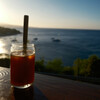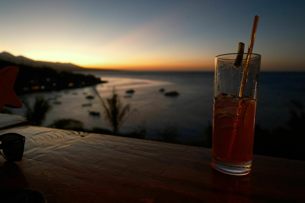 Zum Abendessen und Sonnenuntergangangucken sind wir ins »See you again«-Café auf dem Hügel gegangen. Das hatte 2020 direkt zur Pandemie eröffnet und hatte im ersten Jahr praktisch keine Kunden, die die Besitzer erzählten, das war wohl ein ganz schöner Schlauch. Aber jetzt war es praktisch voll. Obwohl wir die ersten Gäste waren, die diesen Abend kamen, war schon alles ausreserviert. Immerhin konnten sie noch drei Plätze dazustellen. Wir blickten also die erste Dreiviertelstunde direkt in die noch ziemlich warme Sonne, dann kurz in den stimmungsvollen Sonnenuntergang und dann ein Stunde in die nächtliche Bucht, in der das Wasser alienhaft bläulich aufleuchtete, wenn die Nachtaucher mit ihren Lampen nach oben leuchteten. Das Essen und der Arak-Cocktail waren gut und wir sind zufrieden mit Taschenlampe auf der Straße wieder zurückgelaufen.