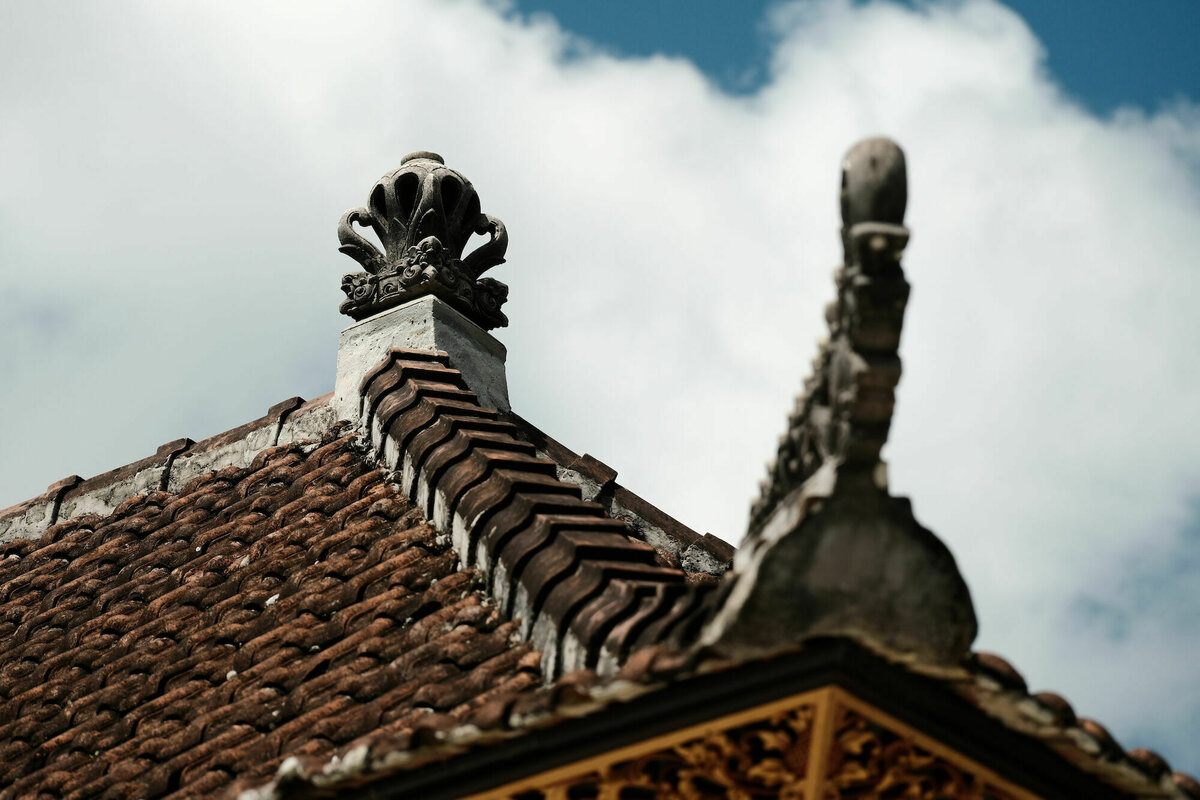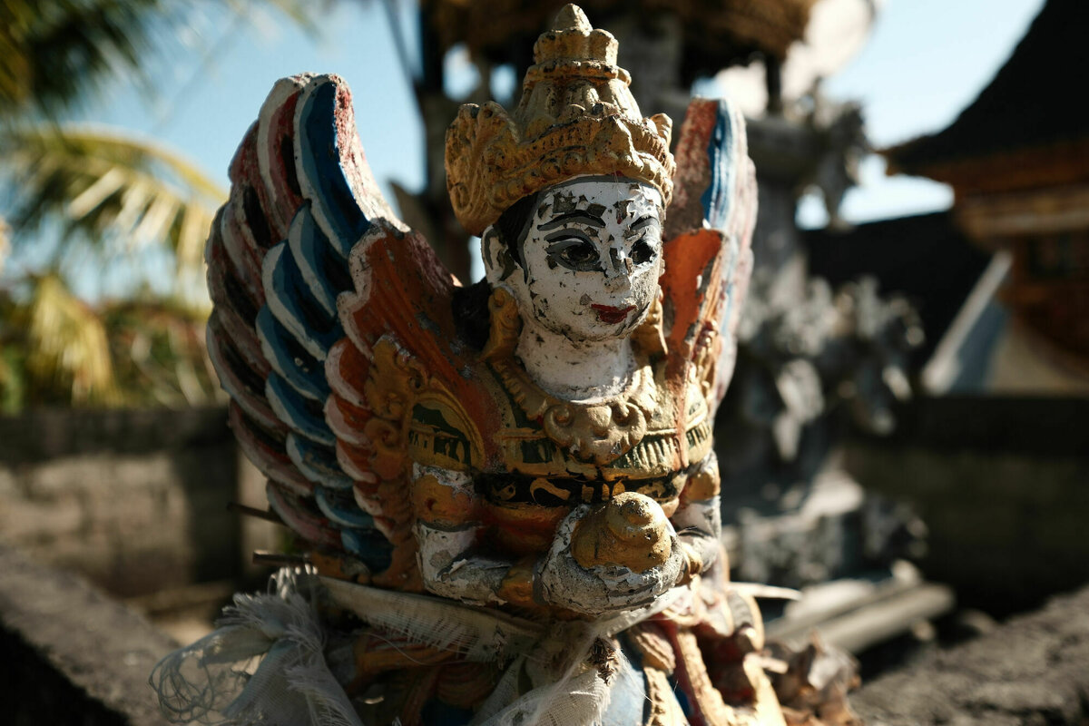 11. August 2023, Nusa Penida, Bali, Indonesien: Je vier kleine Pancakes haben uns genug Energie gegeben, mit den nagelneuen Scootern die Insel zu erkunden. Und die stellte sich als wirklich sehr hübsch heraus, sehr grün und viele kleine Dörfer im Bali-Stil, also mit verziert ummauerten Grundstücken, die mit kleinen und großen Schreinen vollgestellt sind, so dass sie fast schon wie Tempel aussehen. Dazu viele geschmückte Figuren, Räucherstäbchen, Bambusgirlanden und Mengen von Blumen. Bambuswäldchen, Terrassen, Palmen, Bananen, Papaya, usw. Im Gegensatz zu Bali ist die Landschaft aber zerklüfteter, was das Fahren mit unzähligen Kurven, Steigungen und Gefällen etwas interessanter macht. Reisfelder gibt’s hier deutlich weniger.