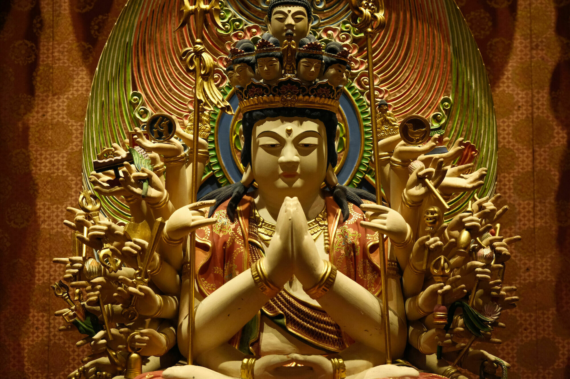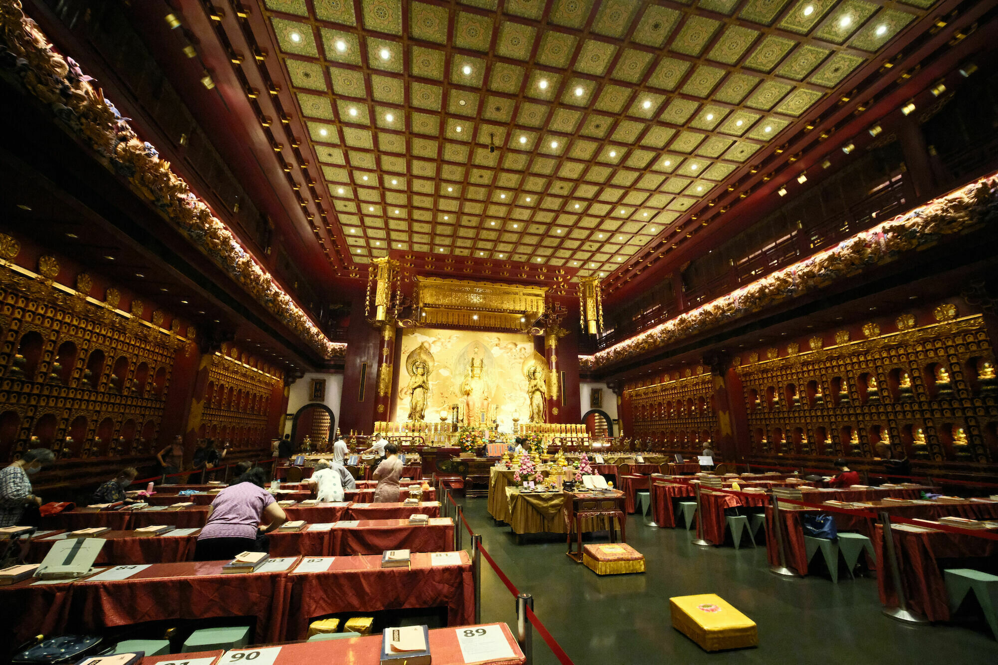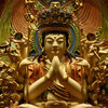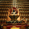 Im erstaunlich gut organisierten und wie nagelneu renoviert wirkenden Zahntempel gab es gerade eine Art Mönch- und Nonnen-Symposium, alle saßen in Kluft an ihren Tischen in einem großen Saal und sangen aus ihren Büchern. Als es vorbei war, wurden die Bücher wieder in Plastikkisten gelegt und die Mönche/Nonnen verließen den edlen Saal, der mit tausenden Buddhas verziert war. Vor allem der Future-Buddha wurde herausgestellt, der einen goldenen Leib hat und in einigen Millionen Jahren wichtig wird, wenn das Darma in Vergessenheit gerät, so teilte uns eine Tafel mit. Eine andere Tafel teilte uns mit, dass der Treppenlift leider gerade kaputt ist. Wahrscheinlich noch ein paar Millionen Jahre.