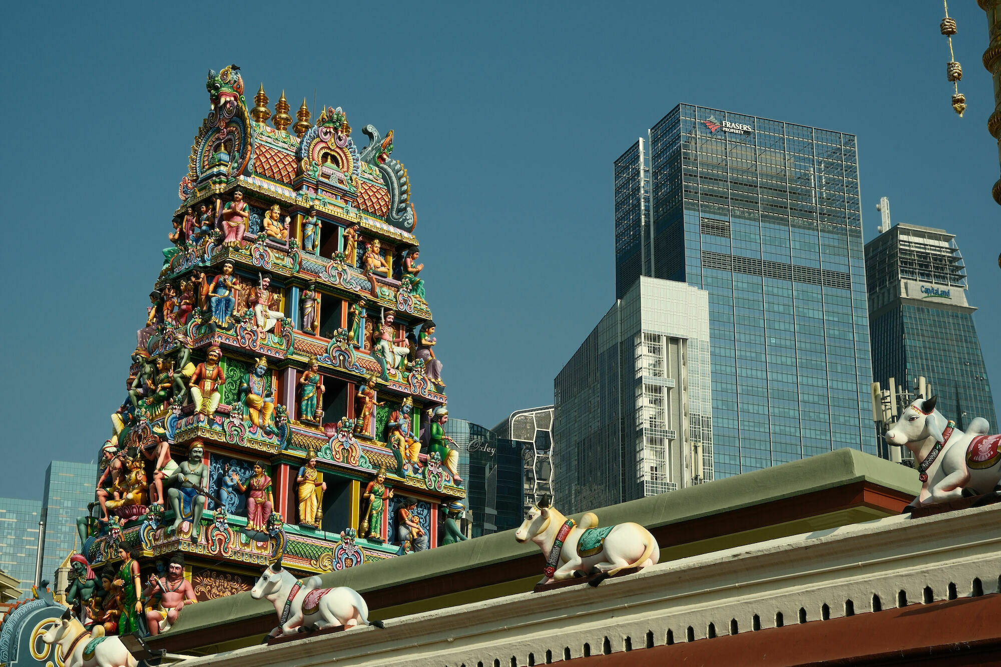 Nach einem weiteren Eiskaffee (hier sind permanent 30 Grad) sind wir ein paar Straßen in den Sri Mariamman Tempel gegangen, einem Hindutempel, in dem eine Familie gerade eine private Zeremonie entgegennahm, begleitet von einem Trommelfinger-Vituosen und einer extrem lauten Oboe (?). Schön zu sehen, wie die Priester (oder wie man die Zeremonienmeister offiziell nennt) sehr routiniert und ohne sichtbare Euphorie Statuen mit Milch, Ghee, Pulver usw. übergießen, abwischen, Flammen entzünden und so weiter. Die Familie war ebenso routiniert, hat sich aber zumindest in Schale geworfen.