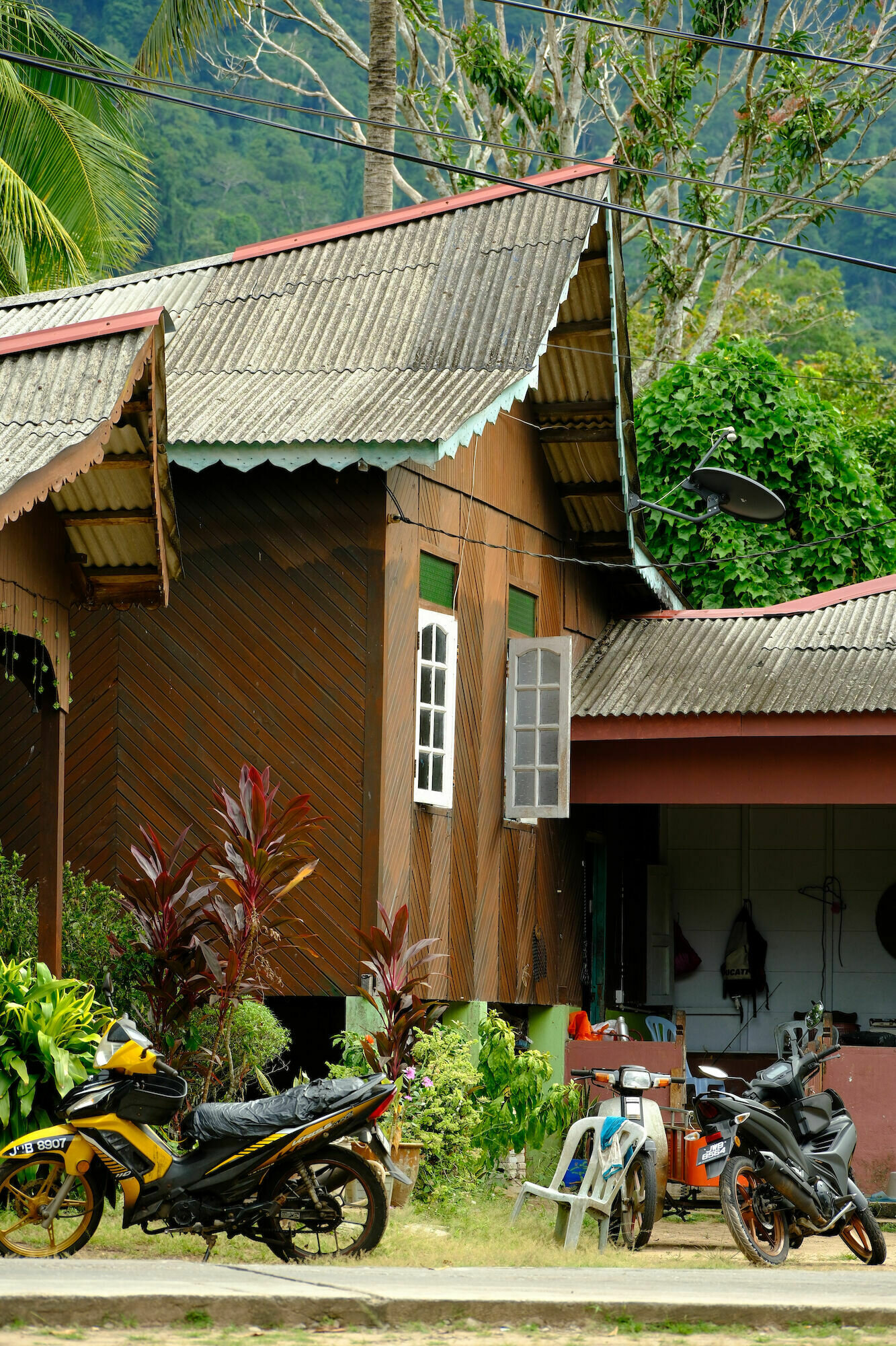 2024-08-21, Pulau Tioman, Malaysia: Wieder einer der lästigen räumlichen Translations-Tage: Früh morgens haben wir unseren (frisch gewaschenen) Krempel nett zusammengerollt in drei dicken Kofferrucksäcken in den schön großen Koffer(rucksack)raum unseres Bezzas gestopft, haben den Müll rausgebracht und und sind anschließend 3 ½ Stunden über mittelgroße und große Straßen Osten gefahren, wo wir in der hässlichen Hafenstadt Mersing (Slogan: »Mesmerising Mersing«) um 12 Uhr unsere Fähre erwischen mussten. Wir waren rechtzeitig da, haben noch ein schlechtes Frühstück (gebratene Nudeln) am Hafen genommen und sind mit einer mittelgroßen und ganz bequemen Fähre in gut zwei Stunden nach Pulau Tioman gefahren.