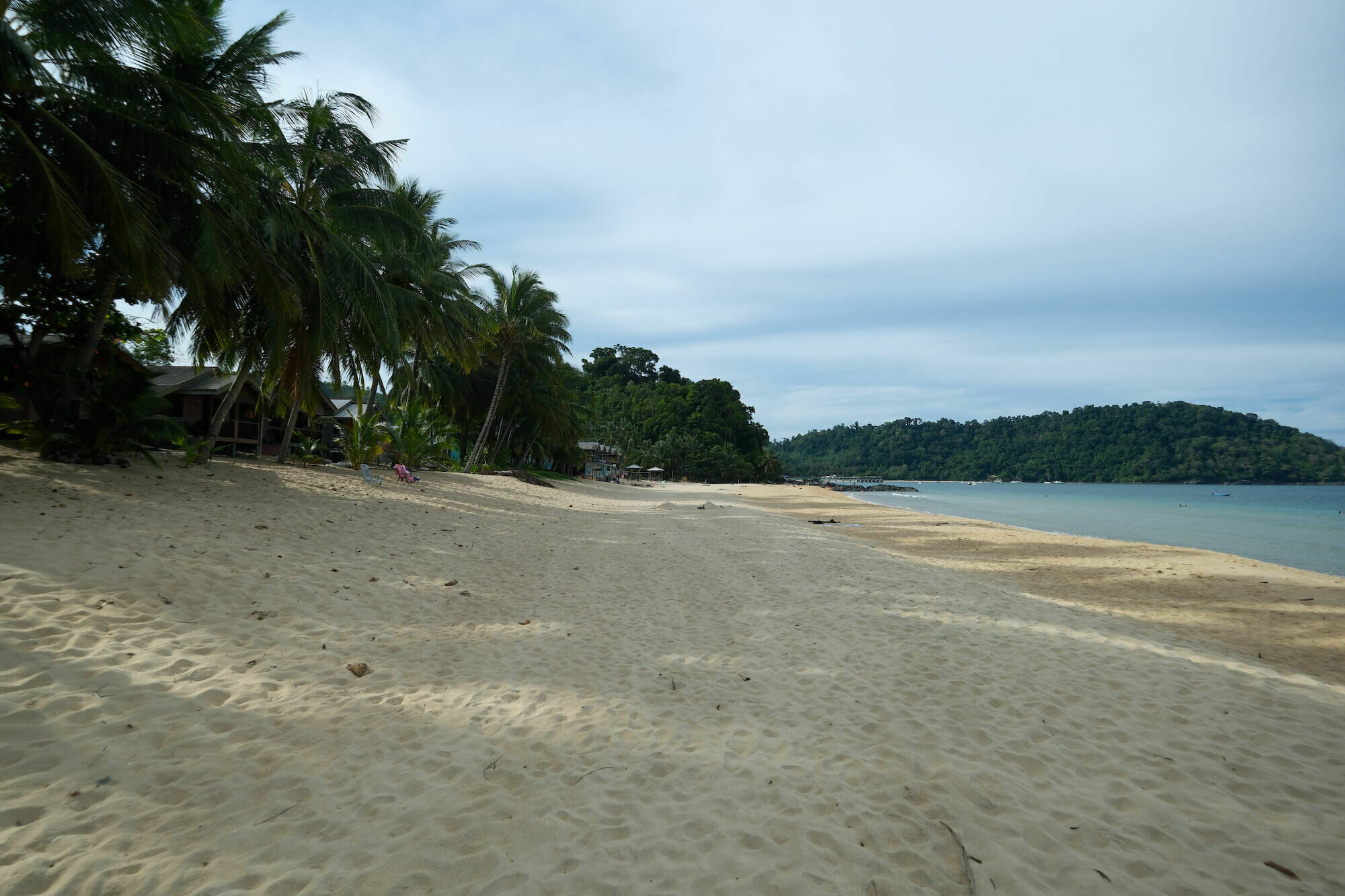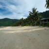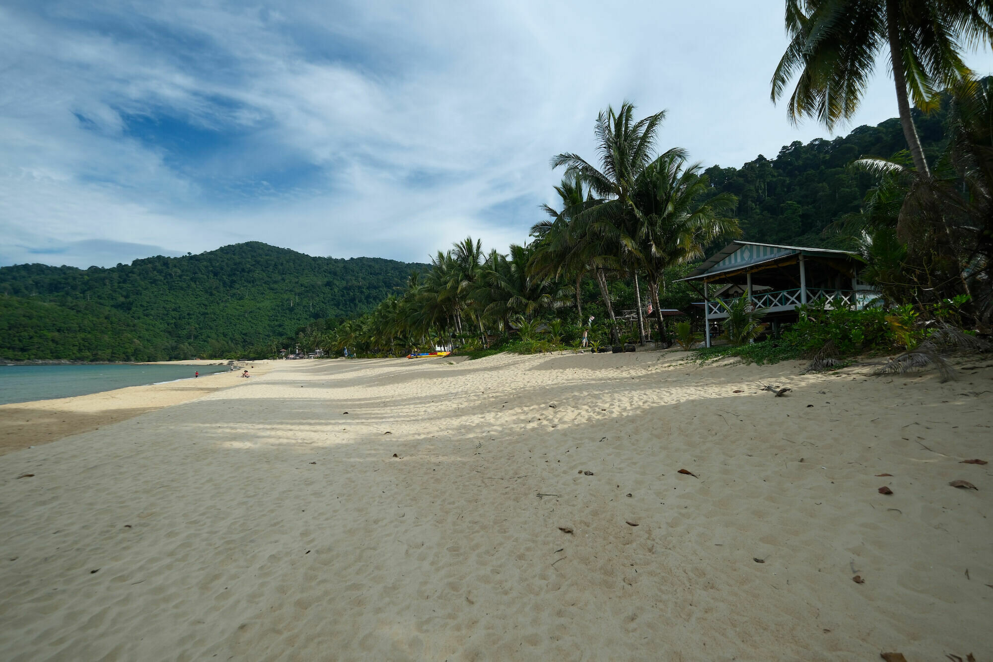 Die Insel ist bergiger, als sie auf der Landkarte aussah (da war sie vollkommen flach) und fast komplett bewaldet. Nur am Ufer gibt es eine Reihe kleiner Resorts. Unsere Unterkunft ist allerdings auf der anderen Seite der Insel. Glücklicherweise gibt es eine einzige Straße auf die andere Seite. Und so sind wir auf der Rückseite eines Pickups bequem auf unserem Gepäck liegend die bis zu 45%-Steigung-Straße durch den Dschungel rauf- und auf der anderen Seite wieder runtergefahren. Wir sind in Juara, einem kleinen, sehr verschlafenen Dorf mit nur sehr einfachen Touri-Unterkünften. Es gibt auch ein paar Restaurants, aber die haben oft zur besten Zeit zu oder bieten wirklich nur sehr einfache (und eher mittelmäßige) Kost an. Dafür sind wir mit unserer einfachen Hütte praktisch direkt am Strand.